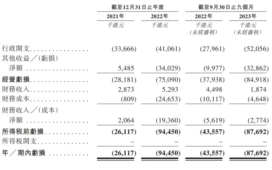 招股书显示,佳鑫国际2021年、2022年行政开支分别为3367万港元、4106万港元;其他收益分别为548.5万港元、-3403万港元。